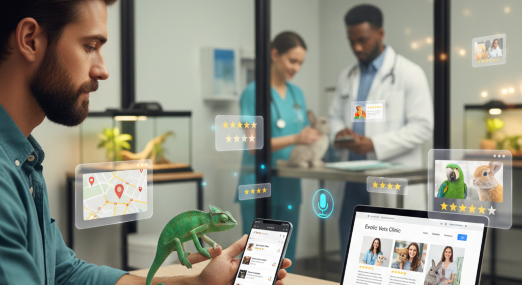 Pet owners looking for an exotic veterinary surgeon no longer follow a simple, linear path. Their choices are fast, comparison-driven, and guided by trust signals they can see instantly. A single poor review, an outdated website, or unclear clinic information can make them click to another practice before you even know they were looking.